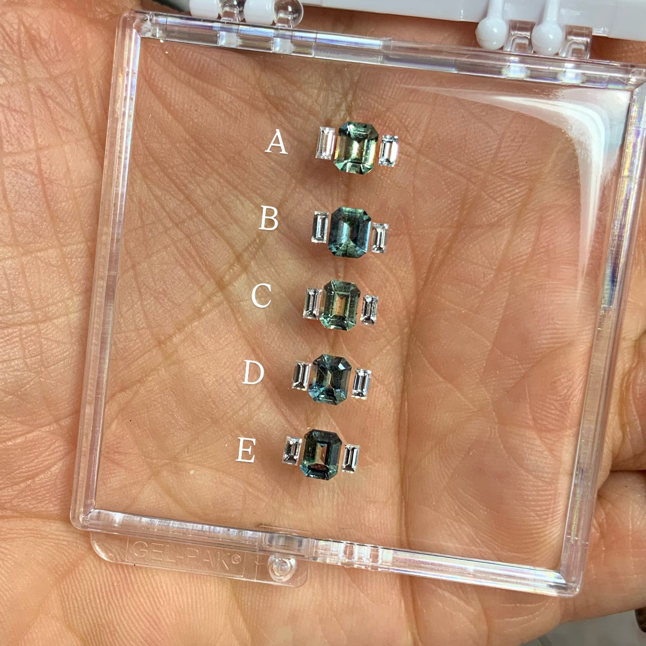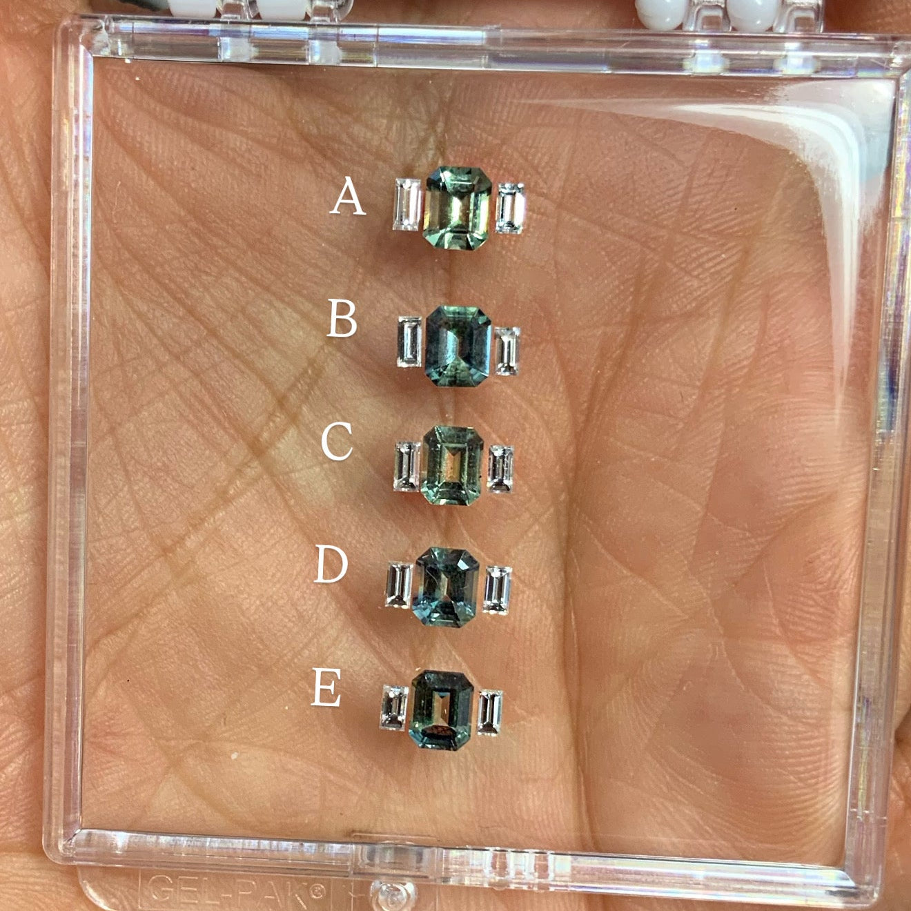 Anillo de Zafiro Verde con tonos azules y diamantes bagette