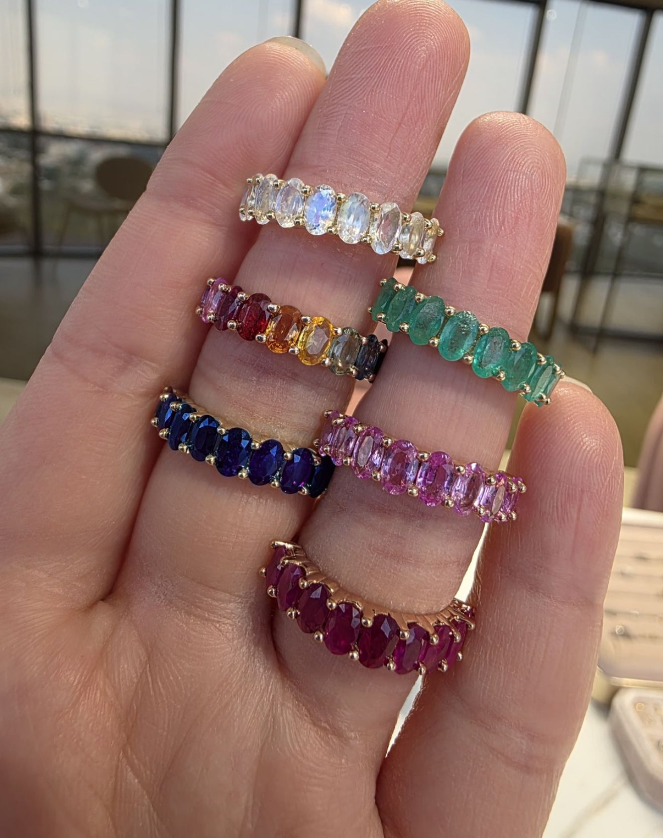 Tiene piedras ovales de 5x3mm ya sean zafiros or rubíes.