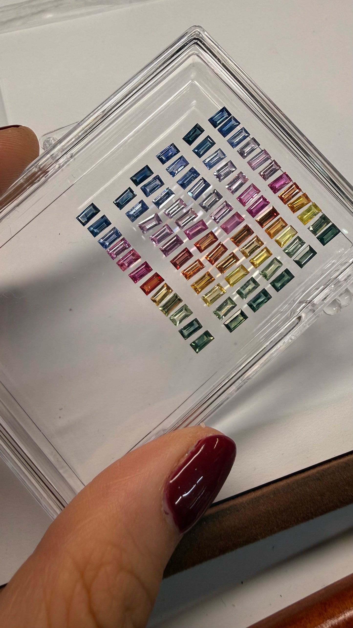 Hermosa media churumbela de Zafiros baguette en tonos arcoíris.