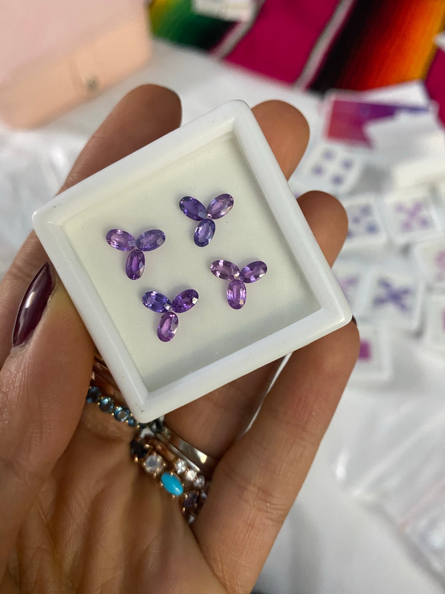 The ring has 3 oval stones of 0.30ct purple sapphire in gradient tones and 4 white diamonds of 0.03ct each.
